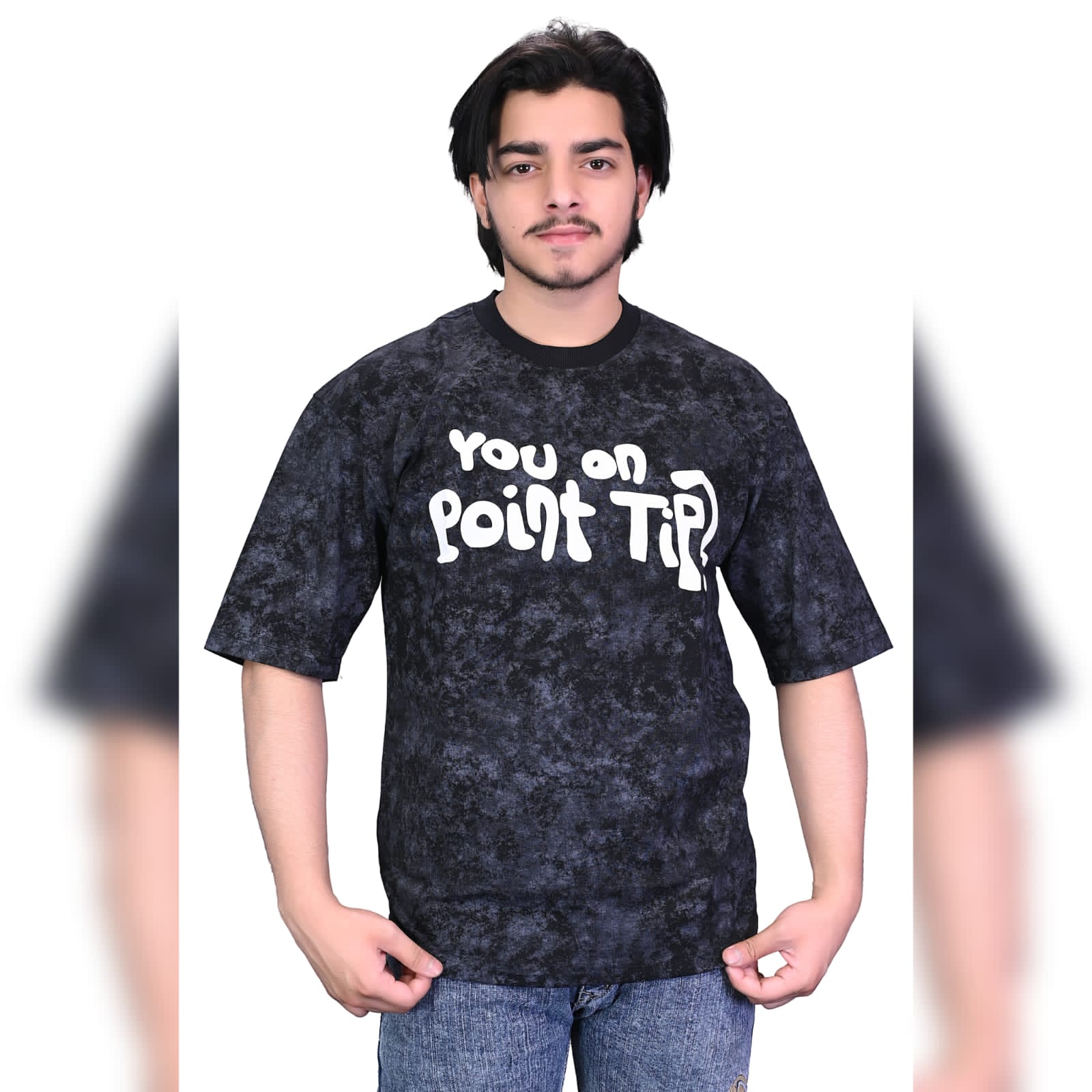 Level up your everyday look with the “You on Point Tip?” Stone Wash Graphic T-Shirt in a bold midnight black finish. Designed with a textured washed pattern and eye-catching white typography, this tee blends street-style attitude with effortless comfort.